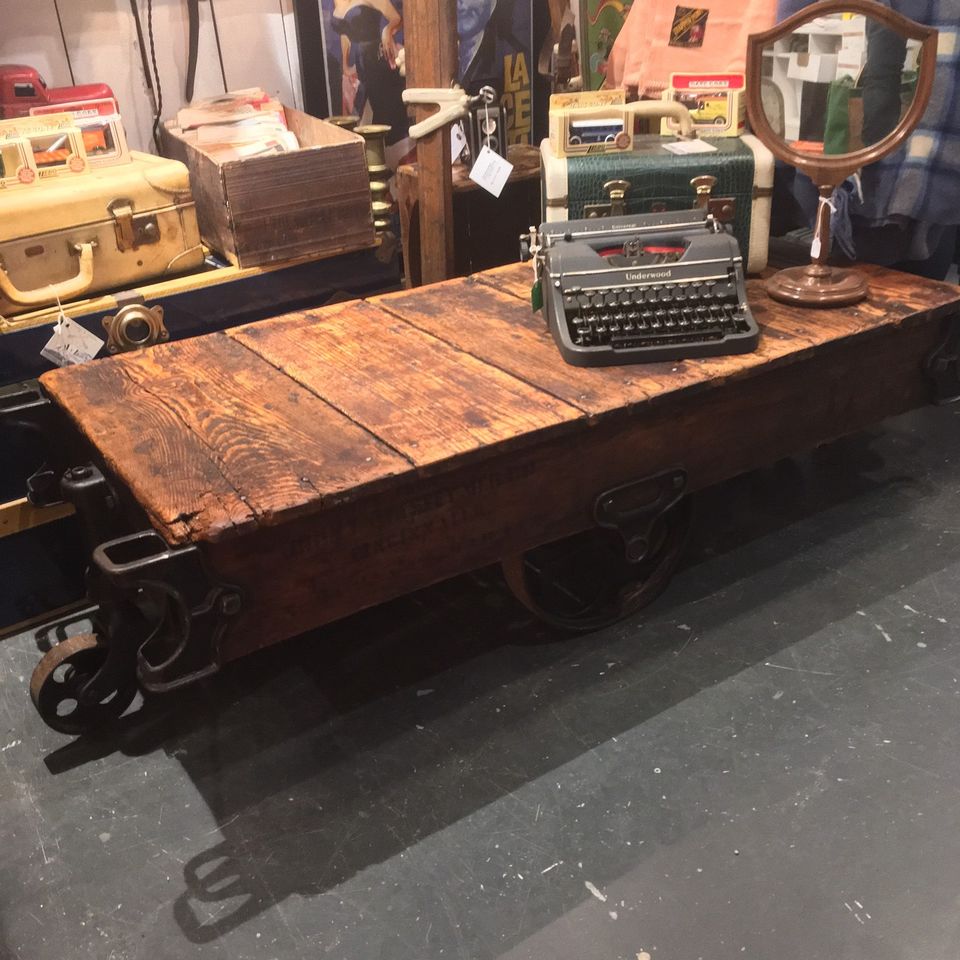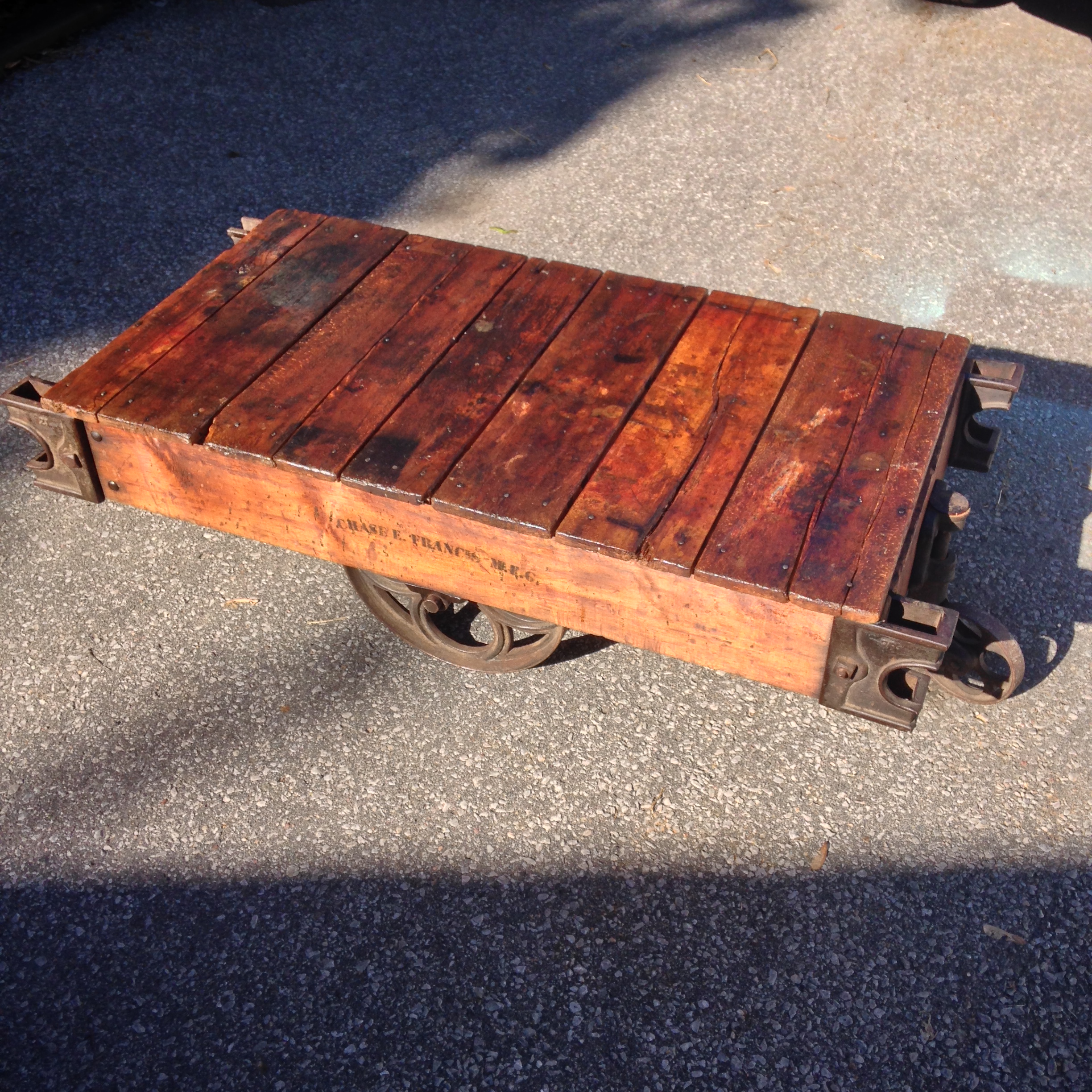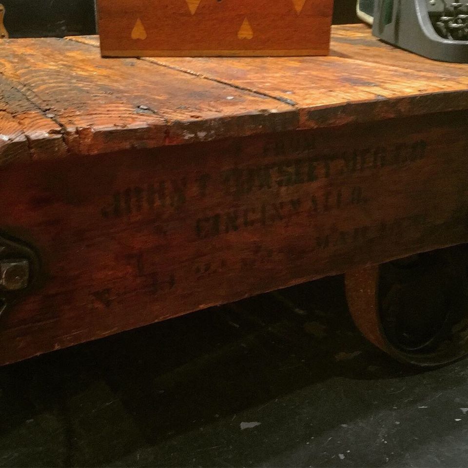 This gorgeous, all original factory cart is in great condition. The wood has stunning patina and has been restored and sealed and is ready to be enjoyed as a coffee table. The original lettering, which is on both sides, shows it is from John T. Towsley MFG Co is Cincinnati, O. 1923. The antique cast iron wheels are great for moving this cart around. Heavy and unique piece. Nice vintage industrial look for your space.