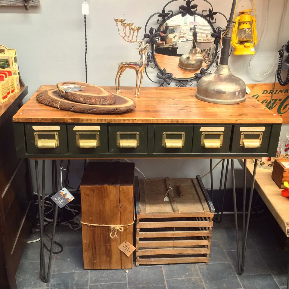 Cool repurposed vintage industrial console table. Could be used as a desk. Original green colour of the metal index drawers is great paired with the wood. Steel hairpin legs make it very sturdy. Nice as a front entry or hall table. Drawers are a good size for holding lots of thing.