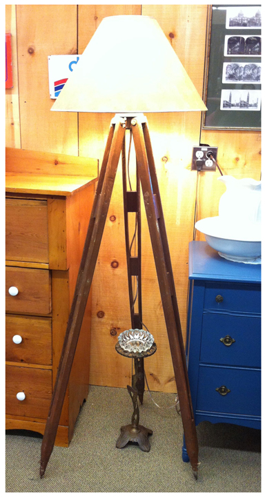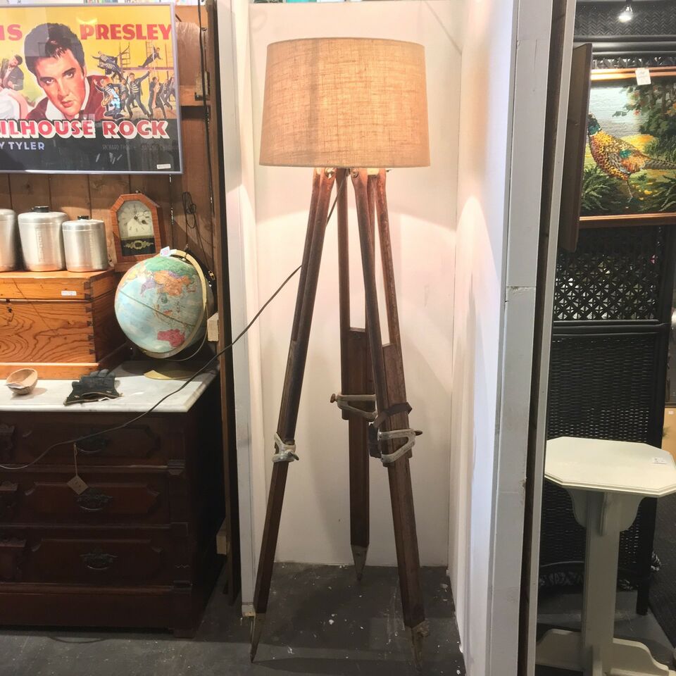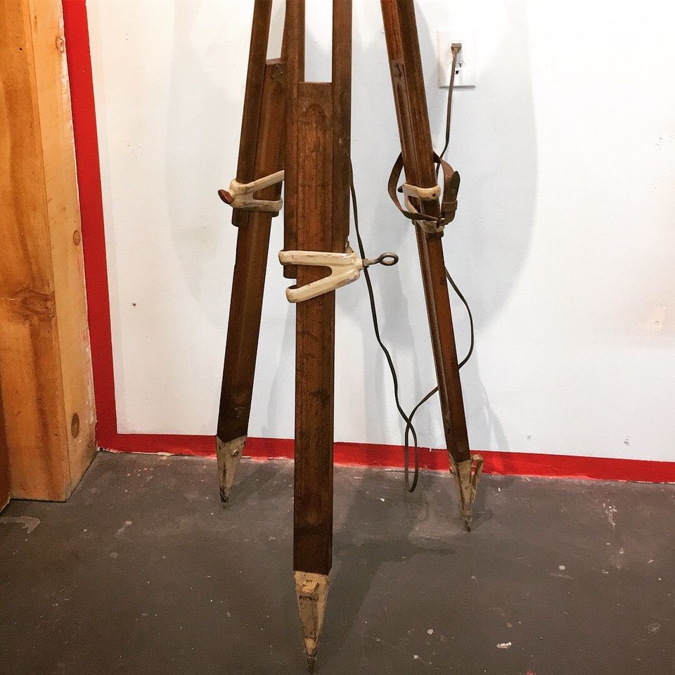 Antique Surveyor tripod transformed into a stunning floor lamp. Great vintage industrial feel. Adjustable height on the legs. Wood has been restored. Nice piece that is a rare find.